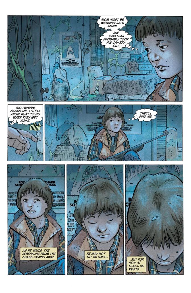 Denotativo.– En la segunda viñeta, se observa a todos los niños reunidos en un sótano, jugando ‘Dragones y Mazmorras’, esos momentos con sus amigos, son lo que hacen que Will olvide un poco esa soledad que siente estando en su casa y se sienta mejor en compañía de sus amigos.